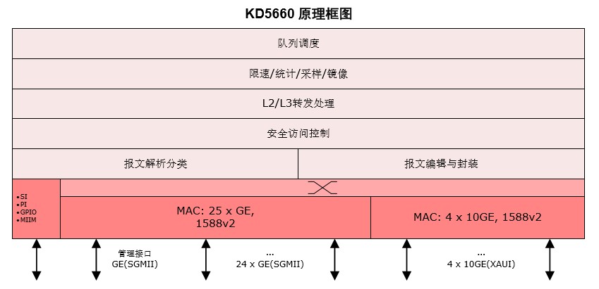 KD5660 包含 24 個 GE 接口、 4 個 10GE 接 口以及 1 個 GE 管理端口,所有網絡轉發業務均 可在最小 64 字節報文情況下達到 64Gbps 的最 高性能。可支持 L2/L3 交換、IP 單播組播路由、 安全訪問控制 ACL 和流量管理功能,并可支持多樣靈活的報文流分類特性以及豐富的管理控制接口。