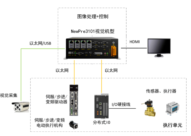 隨著工業自動化技術的發展,機器視覺作為人工智能技術中特點鮮明的代表應用正在滲透到工業自動化領域各個分支中。傳統的機器視覺系統由視覺采集單元、圖像處理單元、控制單元、執行單元四部分組成,東土NewPre3101系列視覺機,在功能上將圖像處理單元和控制單元融合成為一個整體并集成標準運動功能庫,實現視覺檢測與控制的深度結合;在外觀結構上沿用NewPre3101 AI邊緣控制器無風扇、緊湊、小巧的設計;豐富穩定的接口、強悍的內核、良好的易用性和穩定性為機器視覺領域應用保駕護航