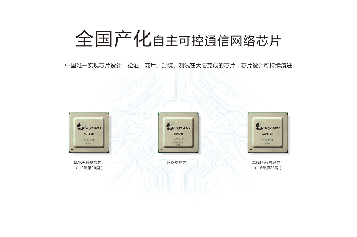 中國第一款國內設計、國內生產流片、國內測試封裝的完全自主可控的通信網絡交換芯片KD5660;中國第一款實時白名單網絡安全交換芯片KD5665;完全自組可控的自組網SDR軟件無線電基帶芯片。