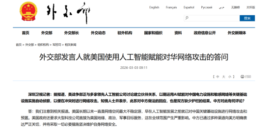 近期,一則關(guān)于“美方以期運用AI對中國電力設(shè)施和敏感網(wǎng)絡(luò)等關(guān)鍵基礎(chǔ)設(shè)施實施自動偵察,以便在沖突時進(jìn)行網(wǎng)絡(luò)攻擊”的報道引發(fā)輿論關(guān)注。外交部在例行記者會上明確表示“中方已經(jīng)通過多種渠道向美方明確表達(dá)嚴(yán)重關(guān)切。我們將采取一切必要措施,堅決維護(hù)自身網(wǎng)絡(luò)安全。”