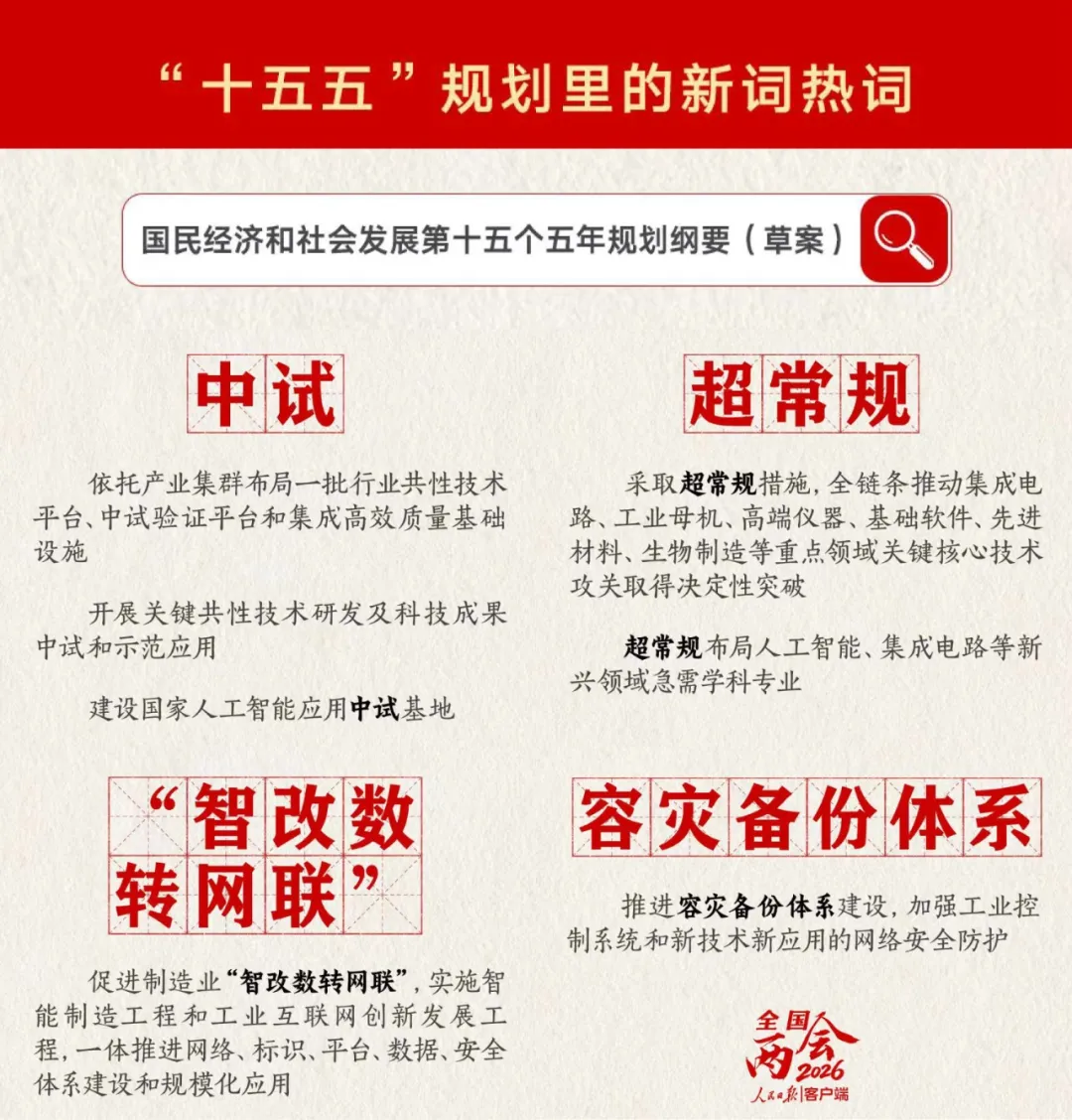 2026年全國兩會明確將具身智能與量子科技、6G、腦機接口等并列列為重點培育的未來產(chǎn)業(yè),政府工作報告提出建立未來產(chǎn)業(yè)投入增長和風險分擔機制,引導資本、人才等優(yōu)質(zhì)資源集聚,降低企業(yè)研發(fā)試錯成本,為全國產(chǎn)化具身智能技術攻關、產(chǎn)品規(guī)模化落地營造了一流產(chǎn)業(yè)環(huán)境,也為民營企業(yè)參與核心技術研發(fā)注入堅定底氣。工業(yè)和信息化部部長李樂成在兩會部長通道明確提出,要大力推動人工智能和制造業(yè)“雙向奔赴”。在“十五五”規(guī)劃里也出現(xiàn)了不少新詞熱詞,包括“智改數(shù)轉(zhuǎn)網(wǎng)聯(lián)”“容災備份體系”“中試”“超常規(guī)”等。