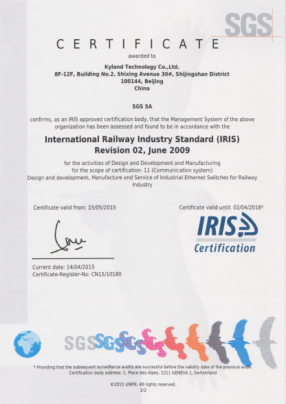 2015年5月15日,北京東土科技順利通過SGS的IRIS審核并獲得證書。IRIS(國際鐵路行業(yè)標(biāo)準(zhǔn))是由歐洲鐵路行業(yè)協(xié)會(huì)(UNIFE)制定的,并得到了四大系統(tǒng)制造商(龐巴迪、西門子、阿爾斯通和AnsaldoBreda)的支持與推廣。