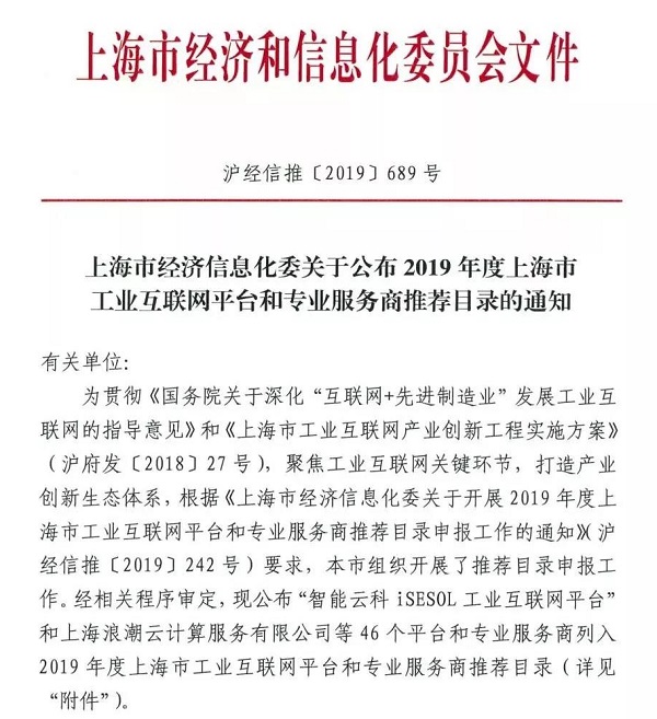 2019年9月,上海市經濟信息化委關于公布了2019年度上海市工業互聯網平臺和專業服務商推薦目錄的通知,共計46個平臺和專業服務商列入2019年度上海市工業互聯網平臺和專業服務商推薦目錄。