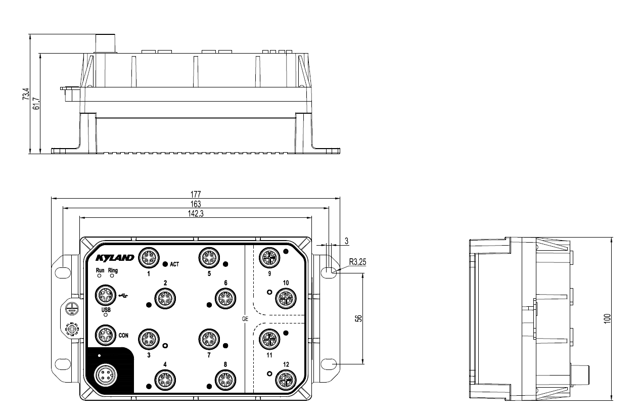 | 機械結構 | 外殼: 金屬 散熱方式: 自然冷卻,無風扇 防護等級: IP65 尺寸: 100mm×177mm×111.7mm(H×W×D)帶散熱肋 100mm×177mm×73.4mm(H×W×D)不帶散熱肋 重量: <2Kg 安裝方式: 壁掛式 |