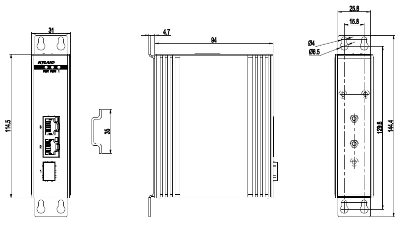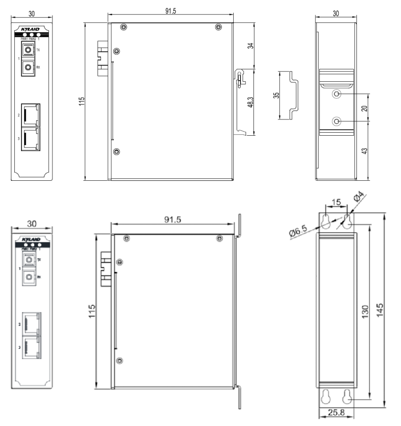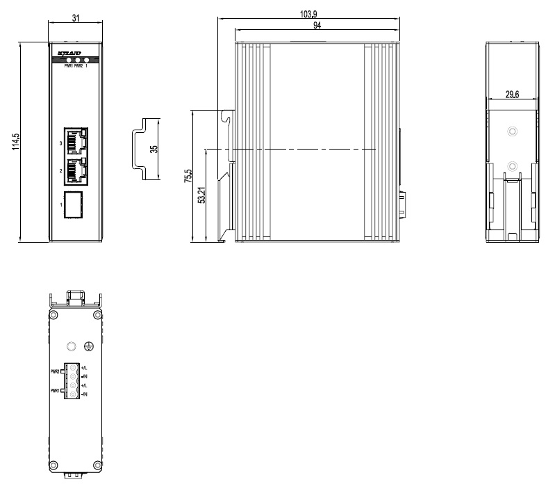 | 機械結構 | 外殼 金屬材質 散熱方式 自然冷卻,無風扇 防護等級 IP40 尺寸 30mm×115mm×91.5mm(W×H×D)(1S2T,1M2T) 31mm×114.5mm×94mm(W×H×D)(1SFP2T) 重量 0.46Kg(1S2T,1M2T) 0.3Kg(1SFP2T) 安裝方式 DIN卡軌式或壁掛式 |