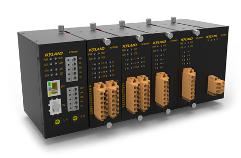 KYRCM遠程I/O通信模塊用于部署遠程I/O。使用一個遠程I/O模塊與若干個I/O模塊拼接,再通過遠程I/O通信模塊上的通信接口,可使用以太網、CAN或串口,與工業服務器或KYC300 PLC控制器連接,成為一個I/O子站。