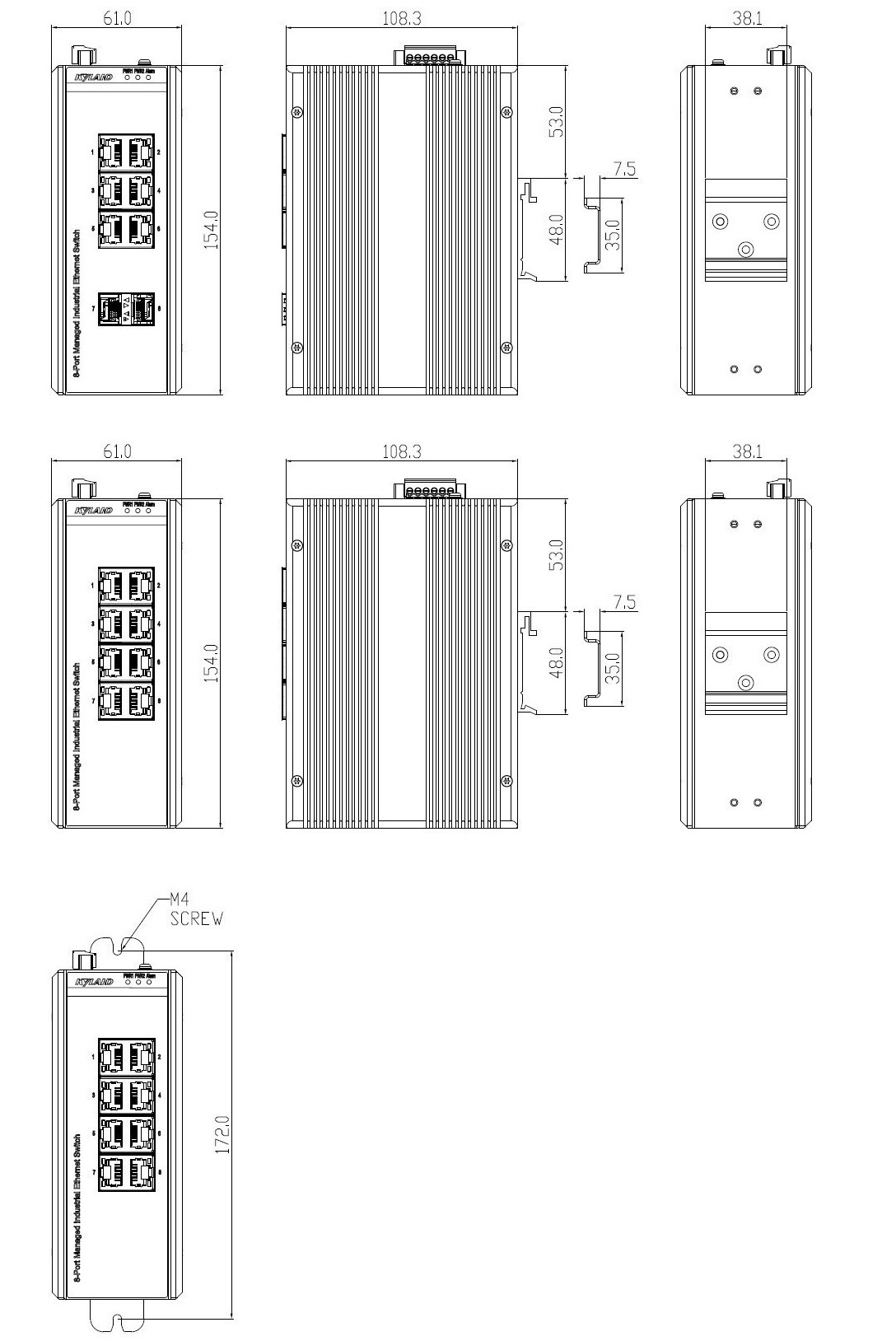 | 機(jī)械結(jié)構(gòu) | 外殼 金屬材質(zhì) 散熱方式 自然冷卻,無(wú)風(fēng)扇 防護(hù)等級(jí) IP30 尺寸 108x154x61mm(W×H×D) 重量 1.3Kg 安裝方式 DIN卡軌式或壁掛式 |